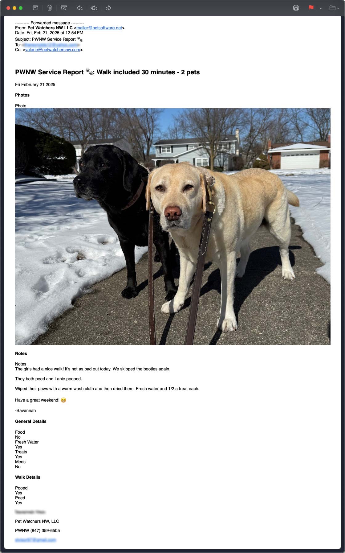 Our pet sitters email Service Reports to our clients at the end of each pet sitting visit. These reports contain photo(s) of the pet(s) as well as specific details about the visit. If our clients have any questions or comments, they may simply reply back to the email or call their pet sitter directly. This way we can ensure that the service is being performed exactly as it should be, specific to each clients’ needs.